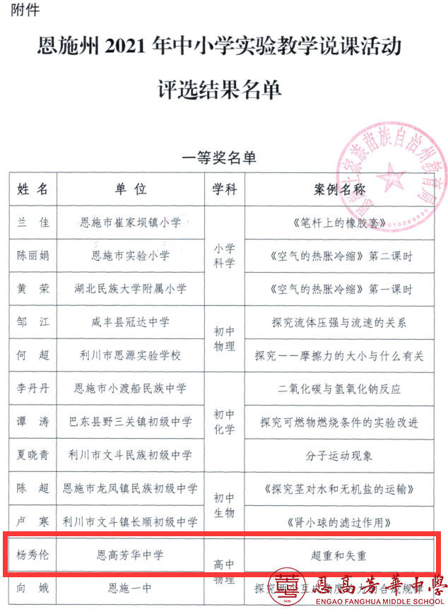 在全州2021年中小学实验教学说课比赛活动中,现金买球高中部物理组杨秀伦老师,生物组程伟老师,化学组吴长宇老师分别获得全州一等奖、全州二等奖、全州三等奖,杨秀伦老师将代表恩施州参加全省说课评选活动。