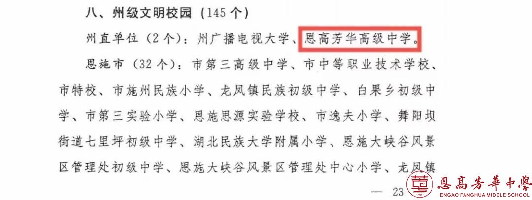 近日,中国共产党恩施自治州委员会(恩施州文〔2021〕67号)文件公布,恩高芳华高级中学被授予第一届“州级文明校园”荣誉称号。
