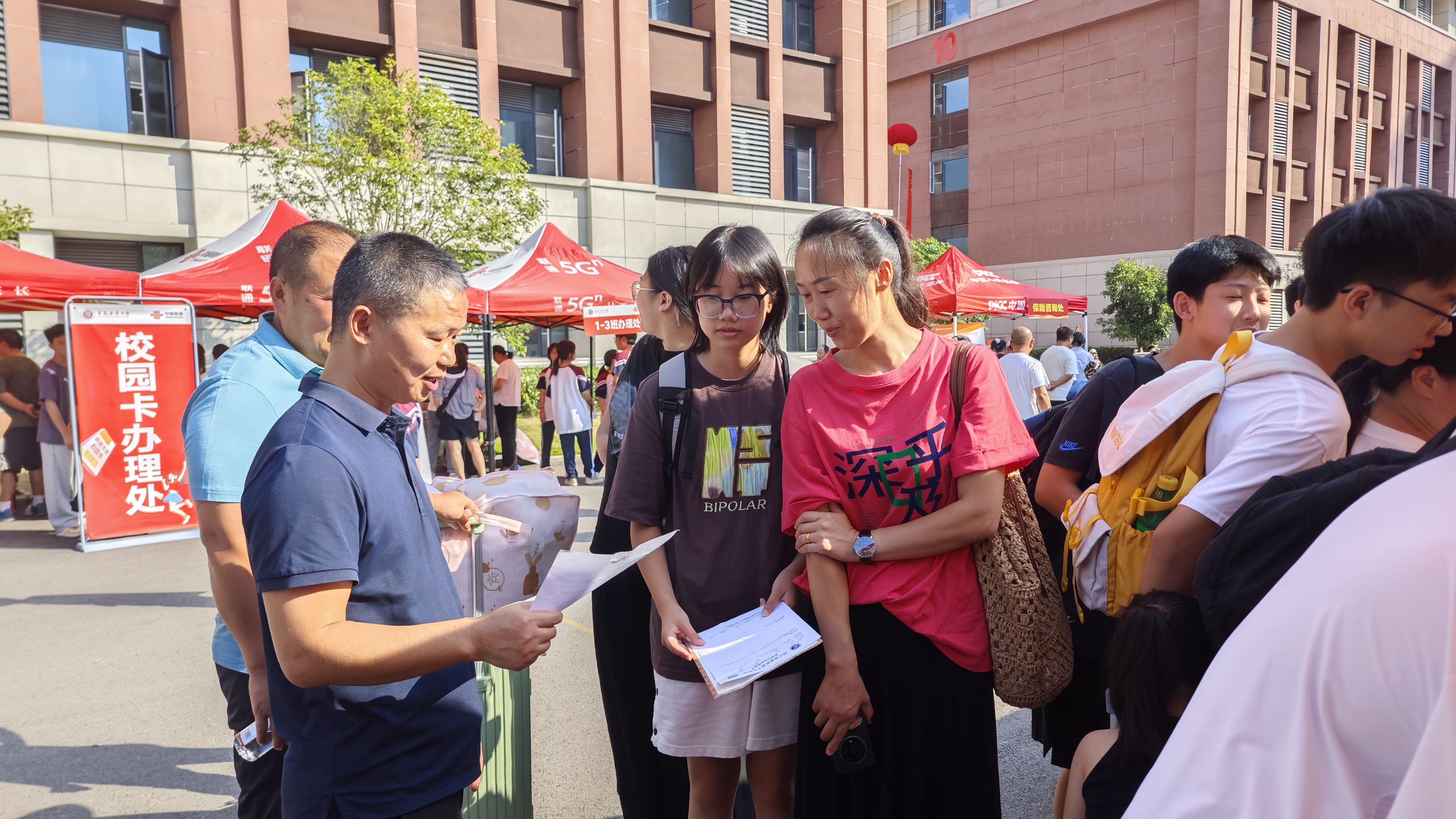 接待现场,热闹非凡。新生们兴奋地交谈着,对即将开始的高中生活充满了期待;家长们在一旁询问着学校的情况,眼神中流露出对孩子们的关切和期望;老师们一边忙着为学生办理入学手续,一边耐心地解答着新生和家长们的各种问题;志愿者们则主动帮忙搬运行李,引导协调,帮助新生们顺利入住寝室。