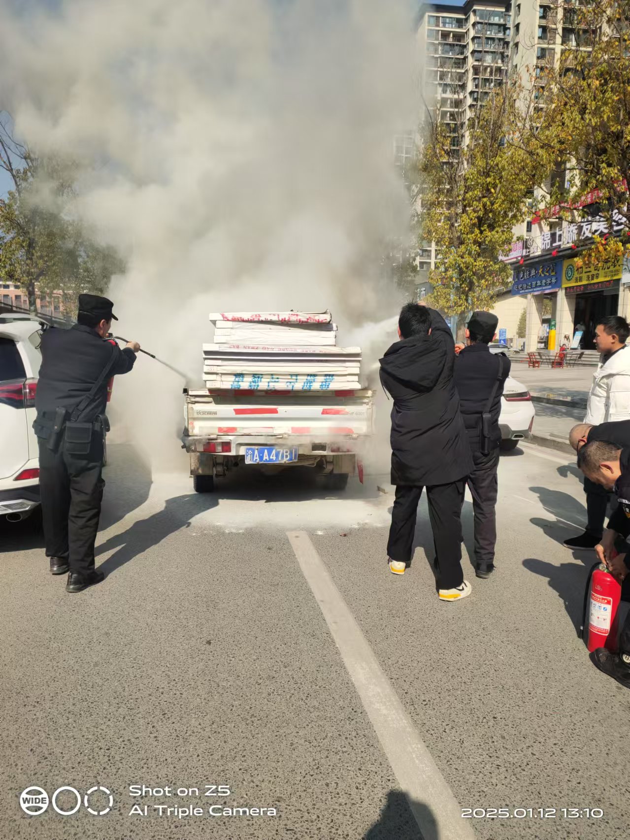 学校东门执勤保安叶香红发现车辆货箱部位有烟雾冒出,而驾驶员并不知道且被前车堵在路中,叶香远迅速上前拦下货运车辆告知货箱着火,一面发出警示,一面组织周围人员疏散,就瞬间功夫,货箱着火部位燃起大火,保安队员王登登、陈常保,德育辅导员冯诚见状立即自东门值班室取出灭火器奔向起火车辆,在几方人员配合下进行灭火。经近30秒扑救,火势被顺利扑灭,并组织起火车辆安全驶离校门,成功化解险情。