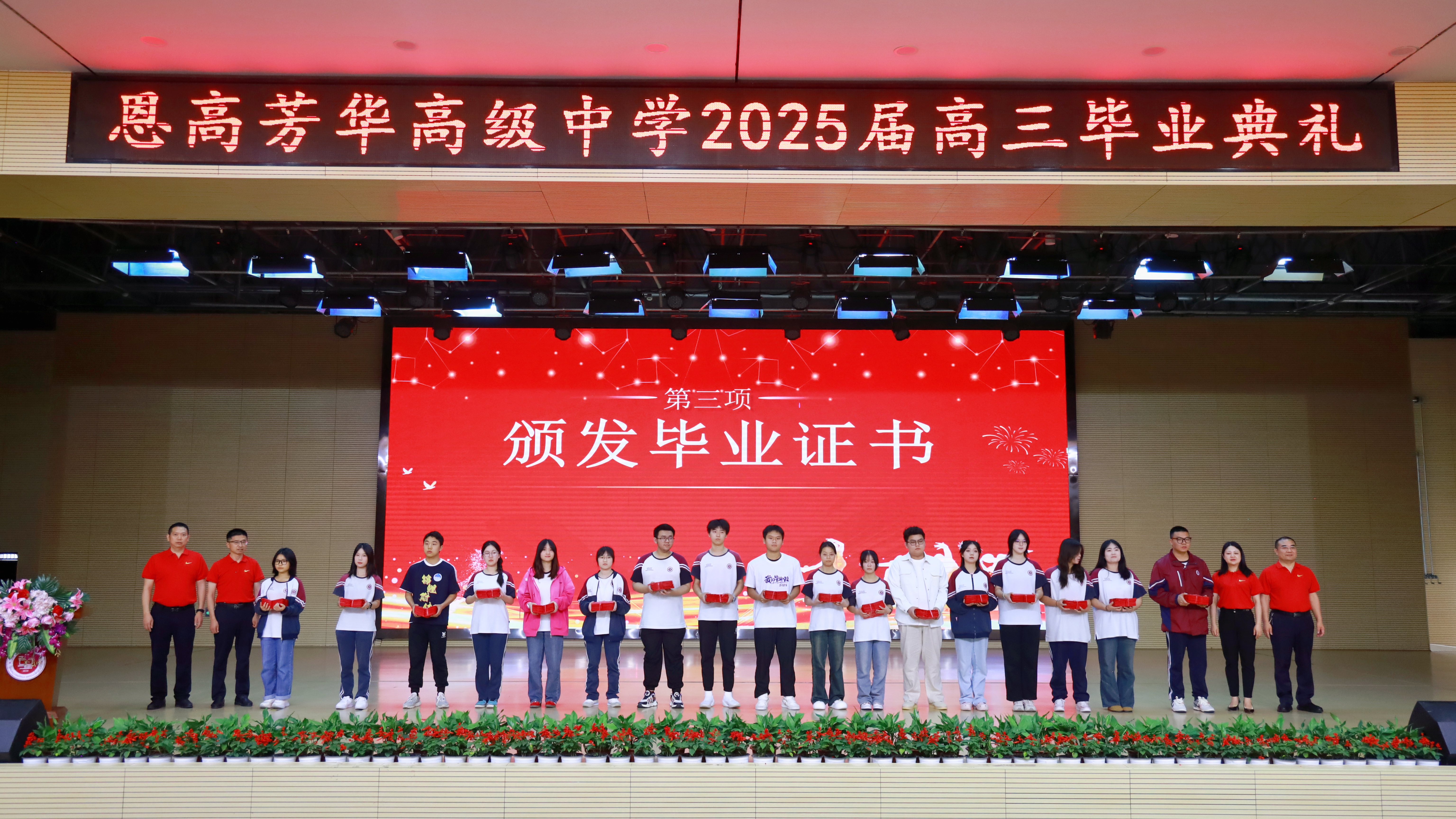 校领导们为各班学生代表颁发毕业证书。一摞摞红彤彤的毕业证书,象征着高中生活的结束,更意味着新征程的开始;是对他们三年学业的肯定,也是对他们未来的祝福。毕业生代表向母校赠送了印有班级合影的牌匾。那一张张自信灿烂的笑脸,是同学们留给母校最好的纪念。
