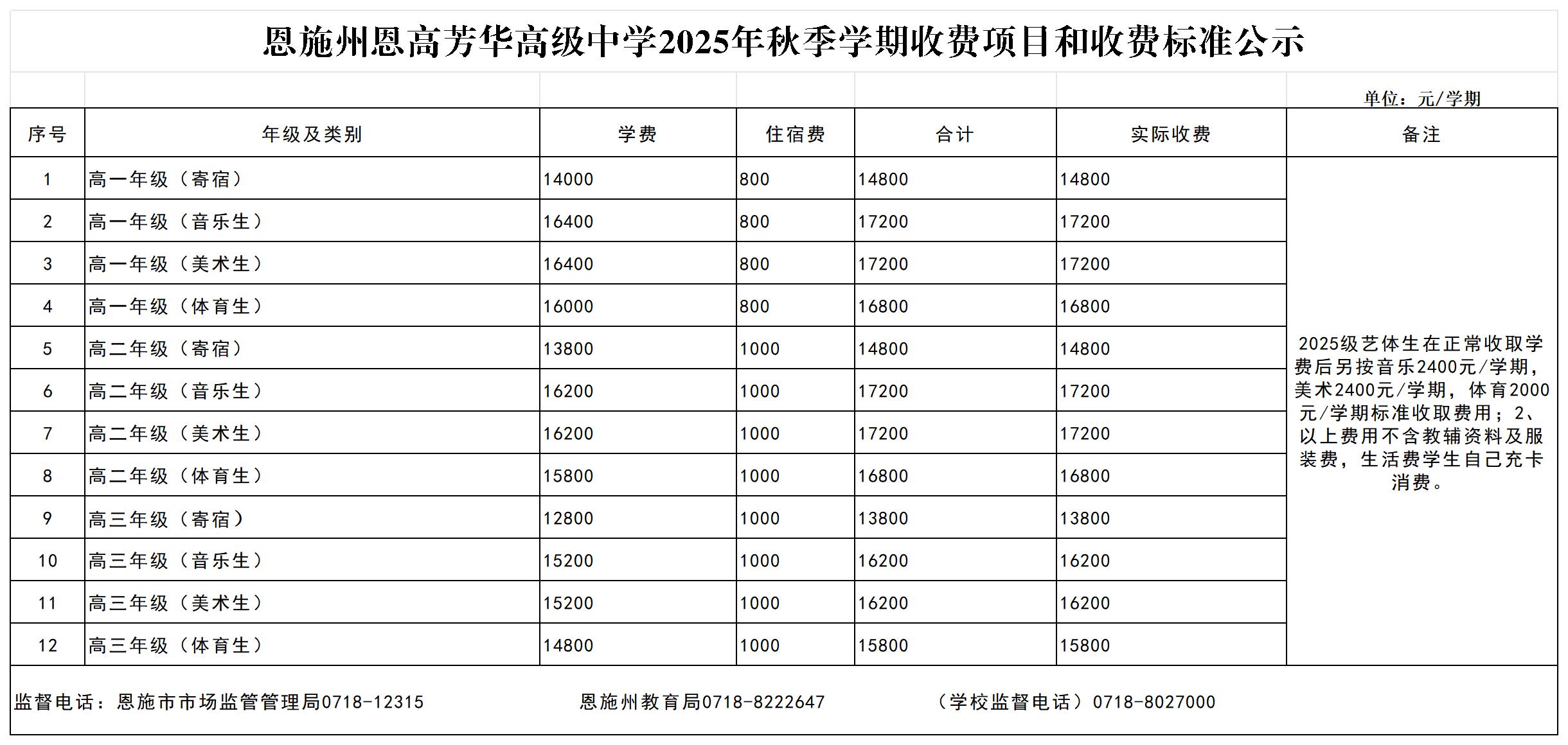 恩施州恩高芳华高级中学2025年秋季学期收费项目和收费标准公示